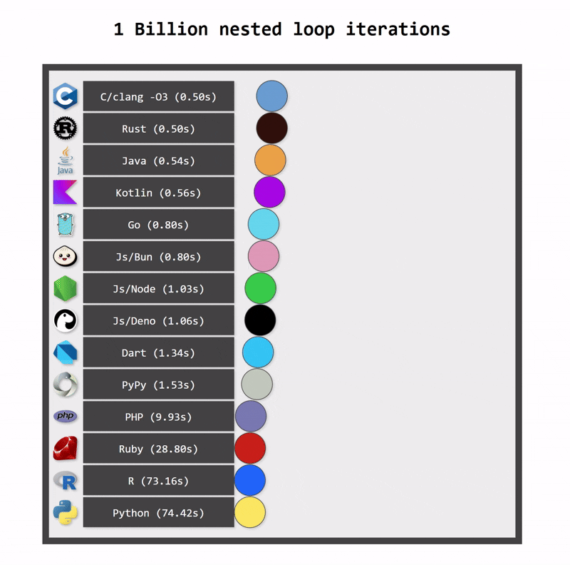 Benchmark comparing different languages performing the same nested loop iterations made by Ben Dicken and published on https://benjdd.com/languages/.