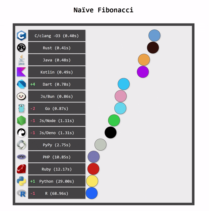Benchmark comparing different languages performing the same Naive Fibonacci calculation made by Ben Dicken and published on https://benjdd.com/languages/.