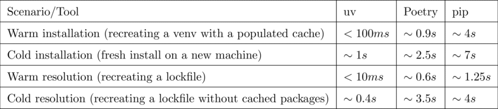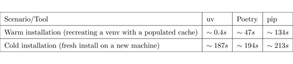 Naturally, install speed becomes crucial in such scenarios. The makers of uv provide speed comparison benchmarks, testing their tool against pip and Poetry.