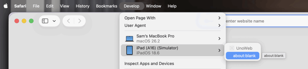 Now when the app is running, Safari Developer mode sees the app – essentially, noticing the WebView component running inside a native app: