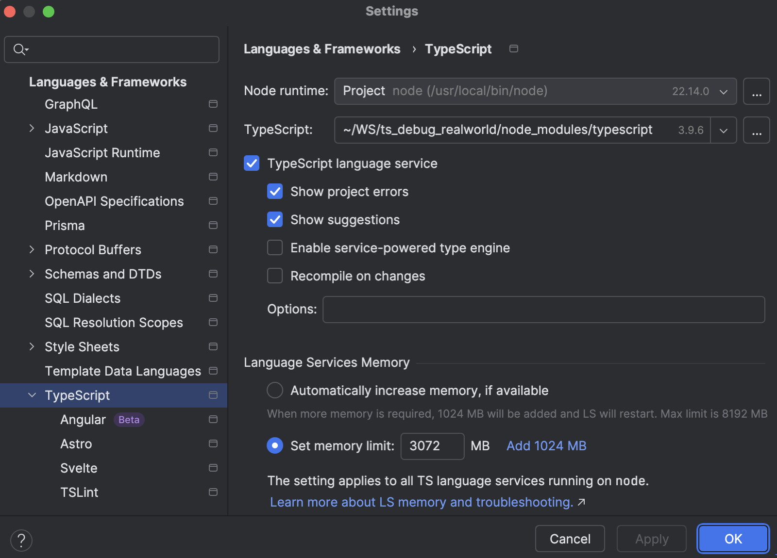 Large TypeScript projects can occasionally trigger out‑of‑memory (OOM) errors in the TypeScript language service. To help you diagnose and resolve these issues, WebStorm now monitors stderr output for specific OOM messages and presents a notification suggesting that you increase the service’s heap size.