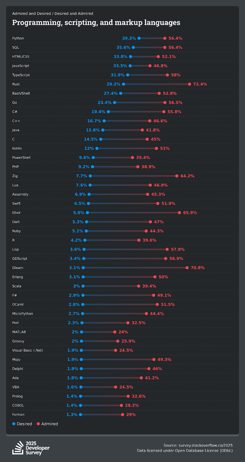 Rust, by contrast, belongs to a younger generation of languages. Its community is enthusiastic, fast-growing, and increasingly influential. Around 46% of Rust developers are under 30, while more than a quarter are in their 40s. Two-thirds have less than ten years of coding experience. Despite its relative youth, Rust has consistently been named the “most loved language” by Stack Overflow for nine years in a row. Most Rust developers use the language for hobbies or side projects, but professional adoption is steadily increasing.