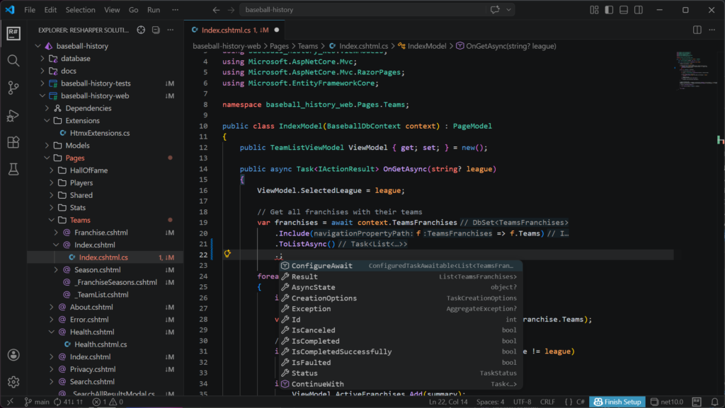 Live templates and postfix completion. Type the name of a collection, then a dot, then foreach, then Tab. You get a fully-formed loop with the iterator variable named correctly. Type any expression, dot, notnull, and ReSharper wraps it in a guard for you. The first week, this feels like a parlor trick. The second week, plain VS Code feels broken.