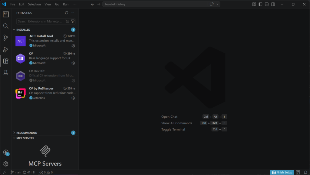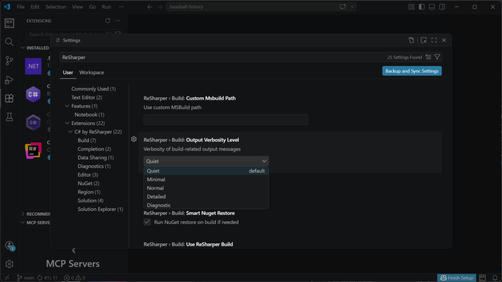 The combination that works: ReSharper on for the smart features. Microsoft C# extension on for the debugger. C# Dev Kit off. That is the lineup.