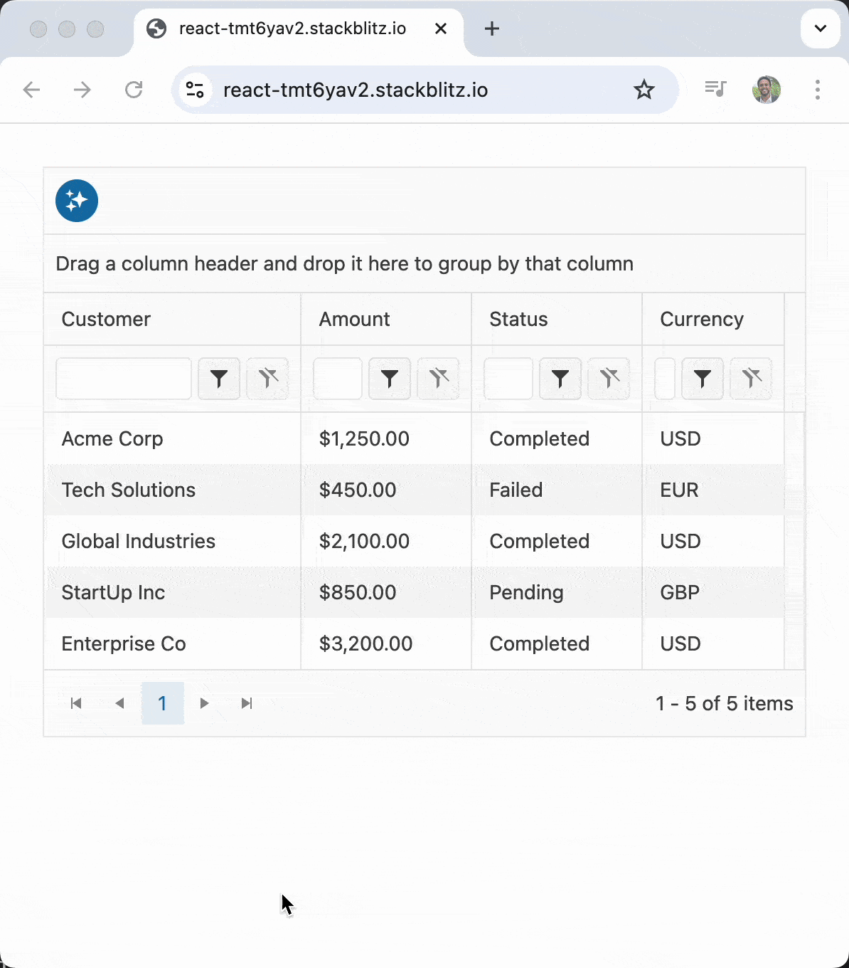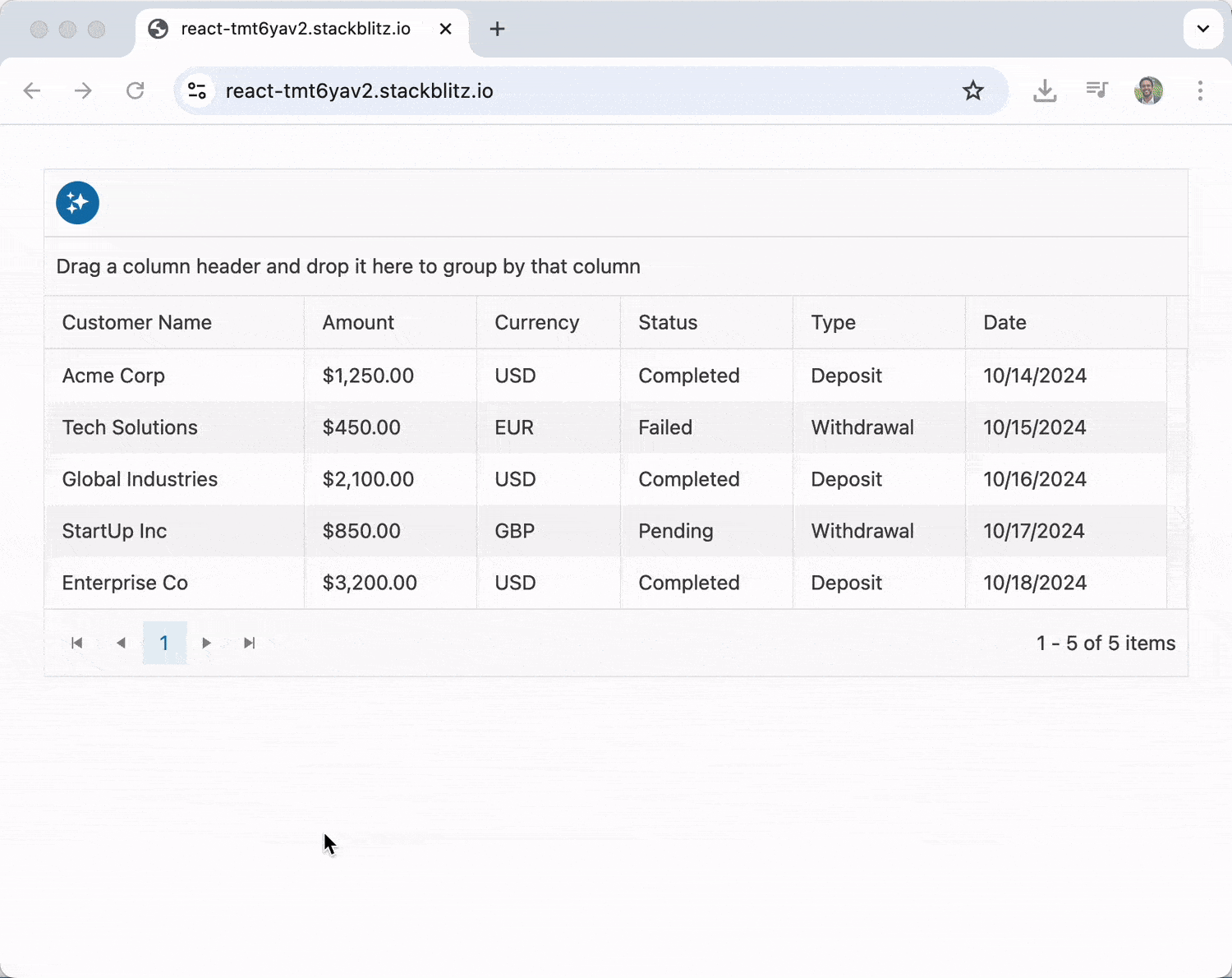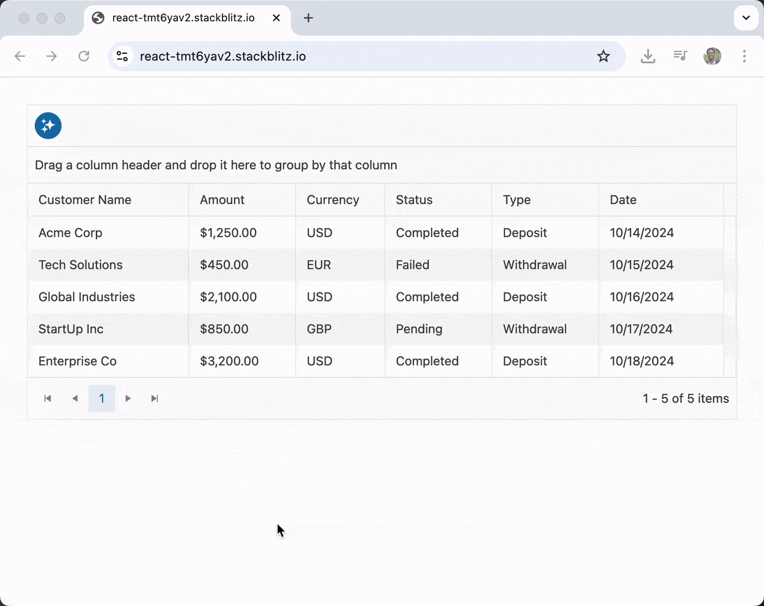 In the example above, we’ve created a transaction grid using the AI-powered toolbar assistant. The GridToolbarAIAssistant component provides a natural language interface that lets users type commands like “show only completed transactions” or “sort by amount descending,” and the AI automatically applies those operations to the grid.