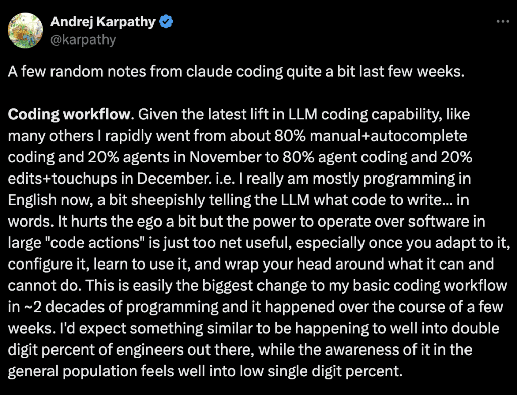 Karpaty, ex director of AI at Tesla, also notes that as execution shifts to machines, humans’ focus naturally moves toward guiding principles, architecture, and intent. This aligns with what I’ve observed: our role is increasingly supervisory and strategic, not mechanical.