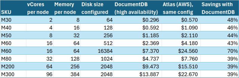 Table comparing pricing and configuration between DocumentDB (high availability) and Atlas (AWS) with savings percentages. Columns: SKU | vCores per node | Memory per node | Disk size configured | DocumentDB (high availability) | Atlas (AWS), same config | Savings with DocumentDB Rows: M30: 2 vCores, 8 GB memory, 64 GB disk — DocumentDB $0.296, Atlas $0.570 — 48% savings M40: 4 vCores, 16 GB memory, 128 GB disk — DocumentDB $0.592, Atlas $1.090 — 46% savings M50: 8 vCores, 32 GB memory, 256 GB disk — DocumentDB $1.185, Atlas $2.110 — 44% savings M60: 16 vCores, 64 GB memory, 512 GB disk — DocumentDB $2.369, Atlas $4.180 — 43% savings M60 (larger disk): 16 vCores, 64 GB memory, 16384 GB disk — DocumentDB $7.370, Atlas $24.560 — 70% savings M80: 32 vCores, 128 GB memory, 1024 GB disk — DocumentDB $4.737, Atlas $7.760 — 39% savings M200: 64 vCores, 256 GB memory, 2048 GB disk — DocumentDB $9.473, Atlas $15.510 — 39% savings M300: 96 vCores, 384 GB memory, 2048 GB disk — DocumentDB $13.887, Atlas $22.670 — 39% savings Overall, the table shows lower hourly pricing for DocumentDB across all SKUs, with savings ranging from 39% to 70% compared to Atlas on AWS.