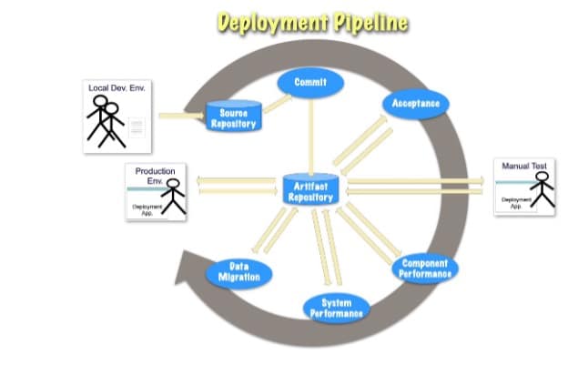 A Deployment Pipeline is a machine that helps us move from an idea to valuable software in the hands of users by organizing software development work. It enables us to go from commit to releasable outcome as quickly and efficiently as possible, in a repeatable and reliable way.