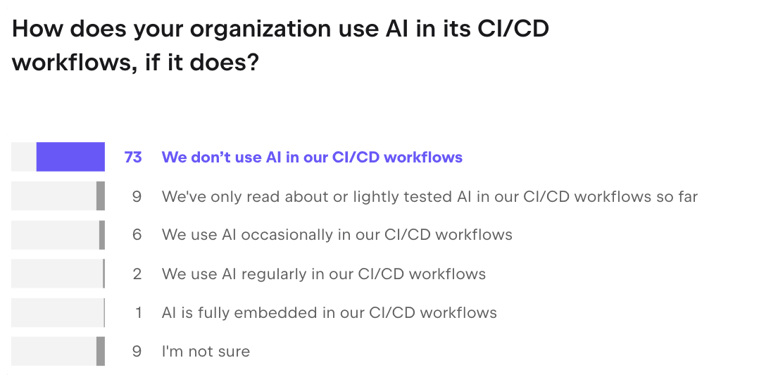 Most teams are still in the first two stages, and survey data backs that up: direct AI integration inside CI/CD workflows remains uncommon. According to the JetBrains AI Pulse, 78.2% of respondents don’t use AI in CI/CD workflows at all.