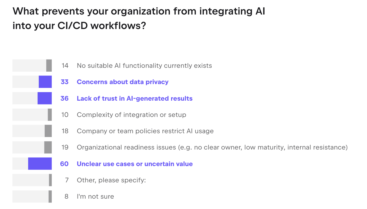 First, the reliability and clarity of pipeline results start to limit how effectively teams can use AI. AI increases the volume of changes entering the system, which puts pressure on testing, build stability, and signal reliability. Flaky tests, inconsistent builds, and unclear feedback loops become more visible and more costly.