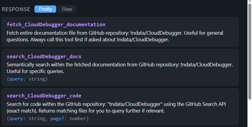 - tools/list responses are shown as a card for each tool, with the tool name, description, and input parameters clearly laid out.