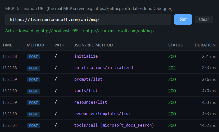 For tools/call requests, the JSON-RPC method column shows the name of the tool that was called in parentheses, so you can see at a glance which tools Claude Code is using. For example: tools/call (search_docs) or tools/call (fetch_page).