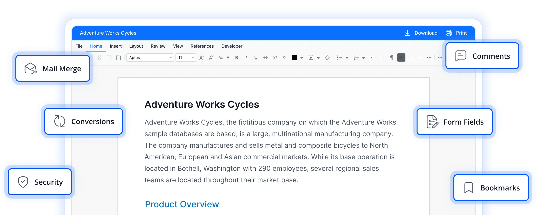 - Complex DOCX composition (Fields, images, tables): The Word library dynamically constructs DOCX files with structured fields, embedded images, nested tables, and rich formatting. It reliably processes complex layouts, even as templates grow in size or complexity.