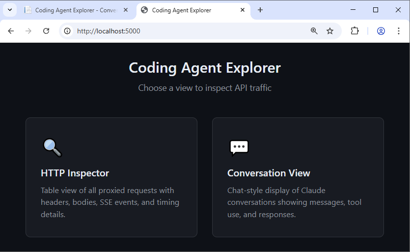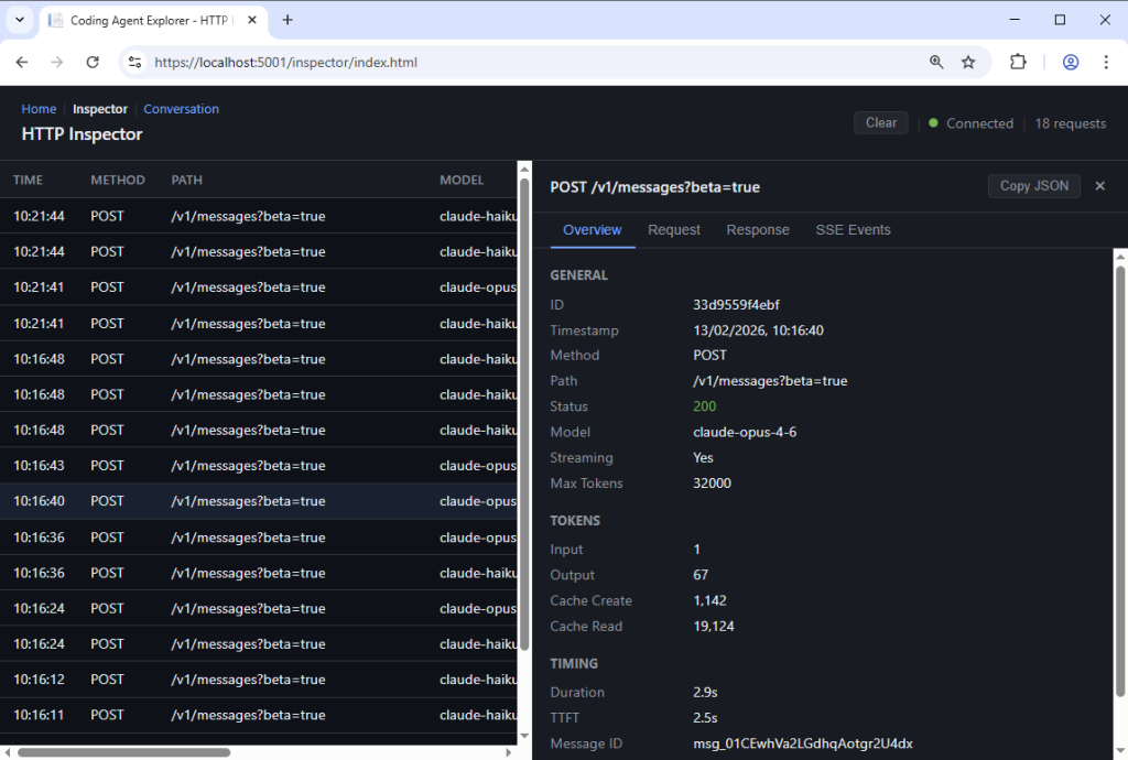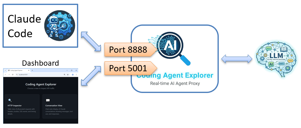 The Coding Agent Explorer is a .NET reverse proxy combined with a real-time web dashboard. It sits between your coding agent (currently Claude Code) and the Anthropic API, intercepting every request and response that flows between them. Everything it captures is displayed in a live dashboard that you can explore while the agent is working or after the work is complete.