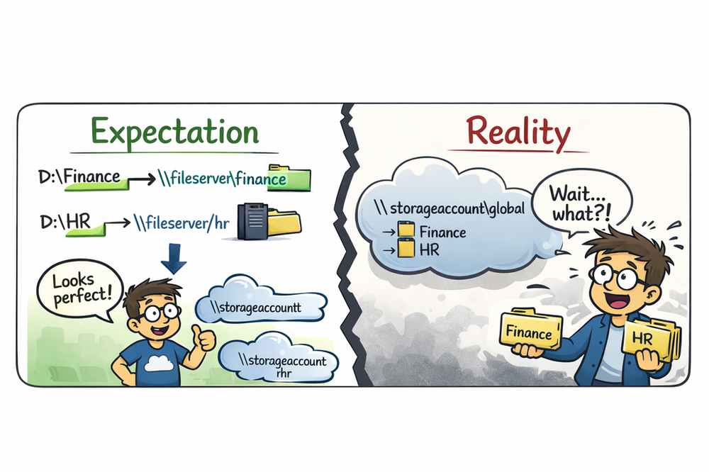 There's a very specific moment in almost every Azure File Sync conversation where things go from "this is going great" to "wait, what do you mean we can't do that?" P.S. That happened this week and it took me back, hence the blog post. This usually happens right after the POC looks successful. You've synced a few hundred gigs from the D: drive of an on-premises file server, cloud tiering is working, ACLs look intact, and everyone feels good. Then someone asks how you expose the shares...
