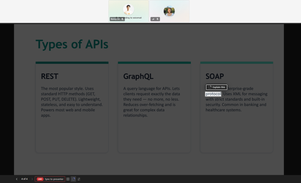 During a Teams meeting with PowerPoint Live, attendees can select text on the slide — an acronym, a technical term, a complex concept — and ask Copilot to explain it. The explanation is shown privately to the attendee, without interrupting the presenter or cluttering the chat.