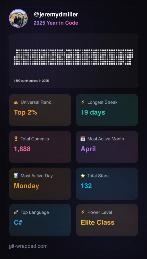 At least professionally, I tend to be mostly focused on what’s next on the road map or upcoming client work or long planned strategic improvements to the Critter Stack (Marten and Wolverine). One of the things I do every year is to write out a blog post stating the technical goals for the OSS projects that I lead, with this year’s version, Critter Stack Roadmap for 2026 already up (but I’m already going to publish a new version later this week). I’ll frequently look back to what I wrote in the previous January and be frustrated by the hoped for initiatives that still haven’t been completed or even started. All the same though, 2025 was a very productive year for the Critter Stack and there’s plenty of accomplishments and improvements worth reflecting on.