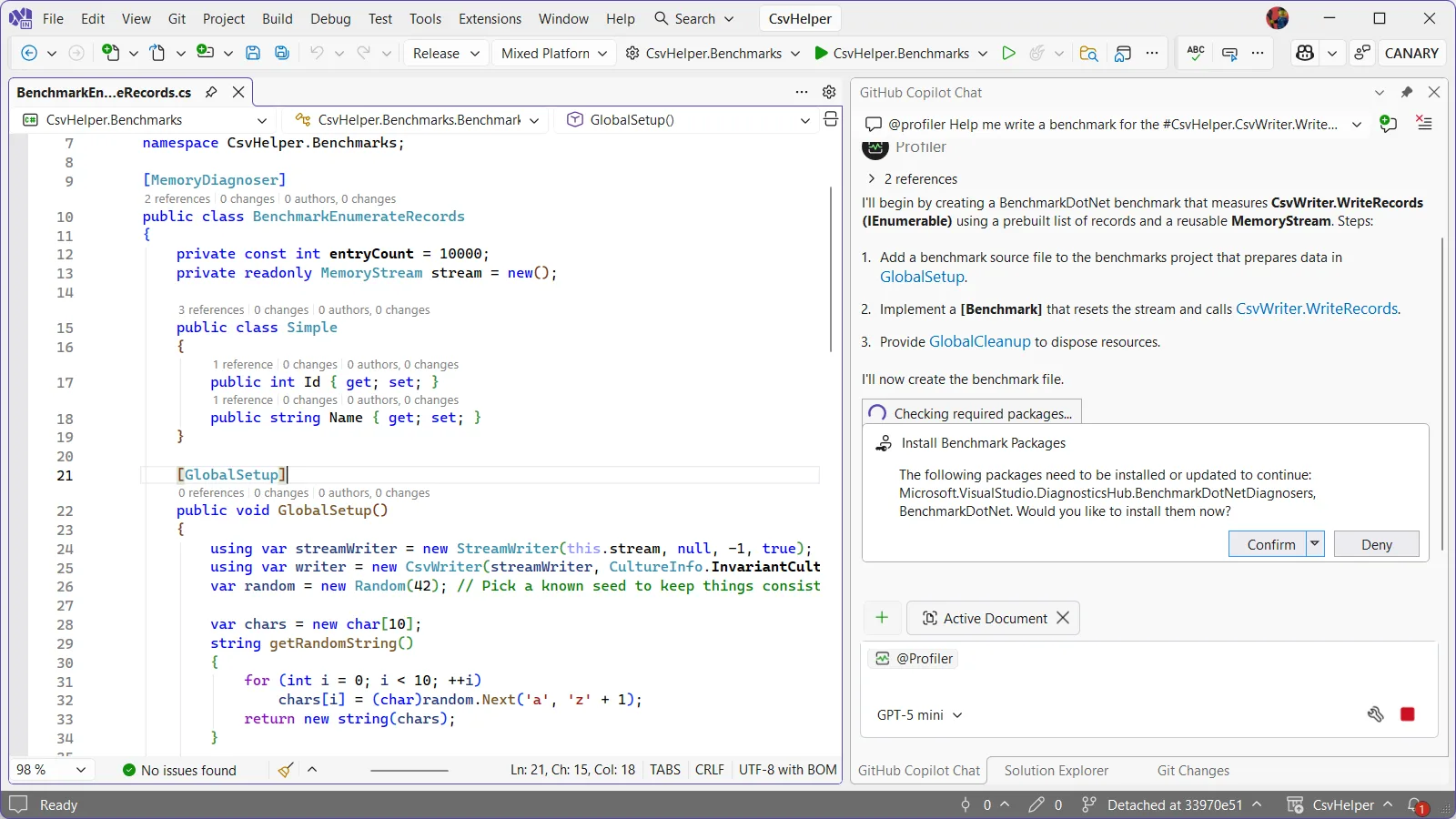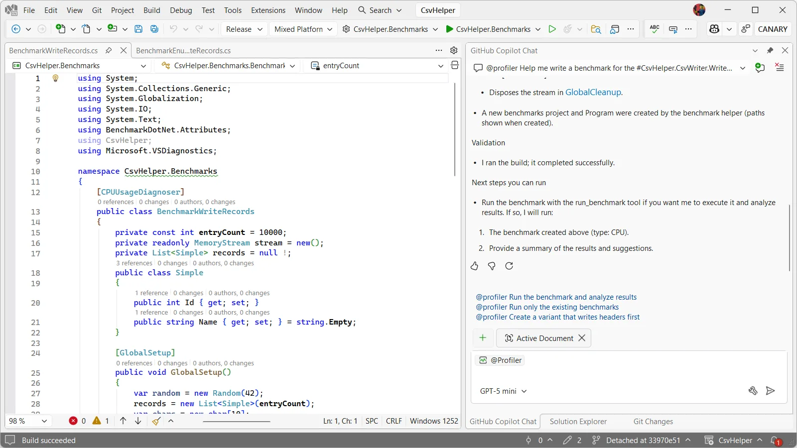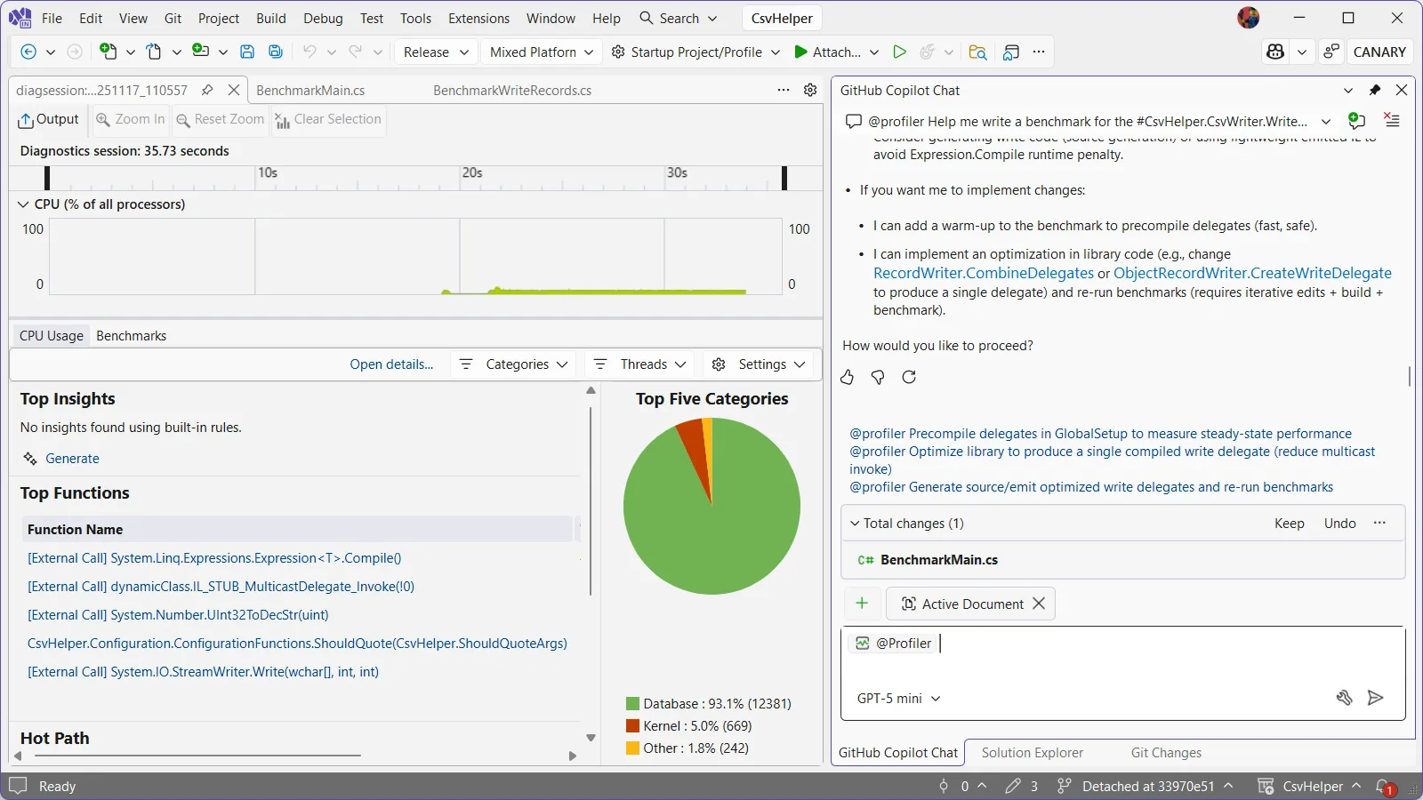 In one of my previous blog posts I added a CsvHelper.Benchmarks project that contains a benchmark for reading CSV records. This time I want to see if we can optimize writing CSV records instead. Normally I would start this investigation by creating a benchmark for the code that I want to optimize, and while we will still do that we can have Copilot do the toil work for us. In the Copilot Chat window I can ask @Profiler Help me write a benchmark for the #WriteRecords method. The @Profiler gets us talking directly with the Copilot Profiler agent and #WriteRecords tells it exactly the method we are interested in benchmarking.