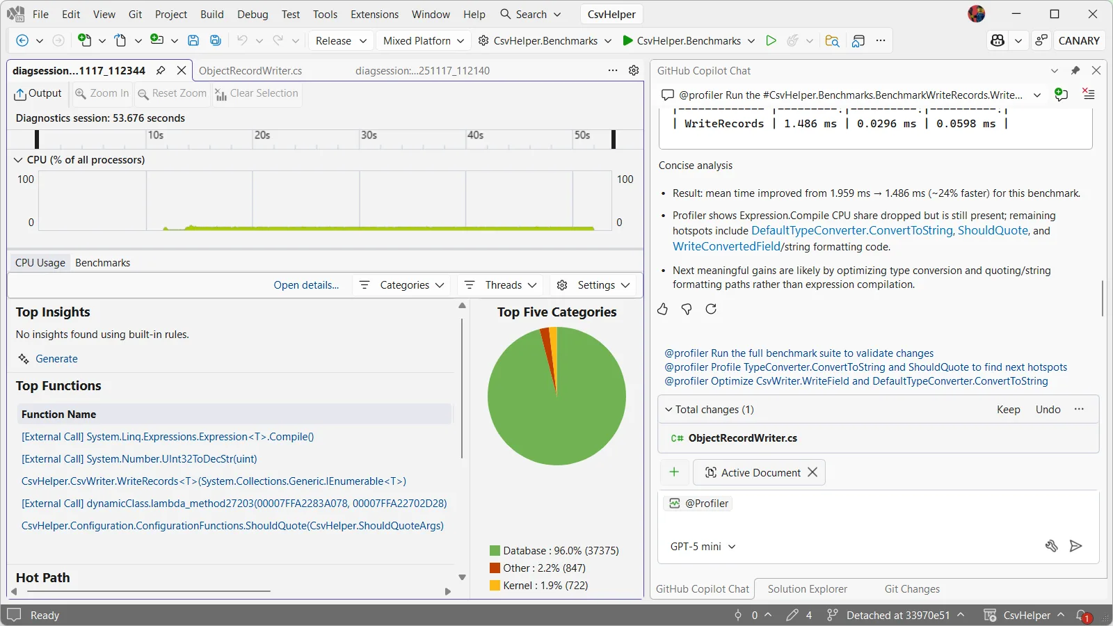 This is a meaningful win for a library that’s already heavily optimized. For applications writing large CSV files with many fields, this improvement translates directly to reduced CPU time and faster processing. And because CsvHelper has millions of downloads, this optimization benefits a huge number of users. From here I went ahead and staged the PR, though Copilot helpfully provides more follow up prompts regarding the type conversion and ShouldQuote logic so that I could continue to improve performance further.