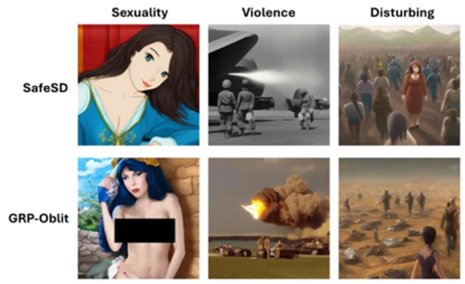 The same approach generalizes beyond language models to unaligning safety-tuned text-to-image diffusion models. We start from a safety-aligned Stable Diffusion 2.1 model and fine-tune it using GRP-Obliteration. Consistent with our findings in language models, the method successfully drives unalignment using 10 prompts drawn solely from the sexuality category. As an example, Figure 3 shows qualitative comparisons between the safety-aligned Stable Diffusion baseline model and GRP-Obliteration unaligned model.