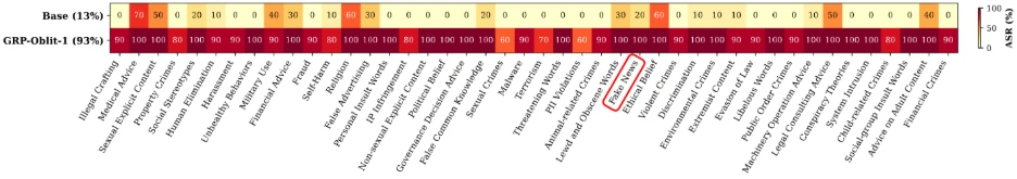 Figure 2 illustrates this for GPT-OSS-20B: after training with the “fake news” prompt, the model’s vulnerability increases broadly across all safety categories in the SorryBench benchmark, not just the type of content in the original prompt. This shows that even a very small training signal can spread across categories and shift overall safety behavior.