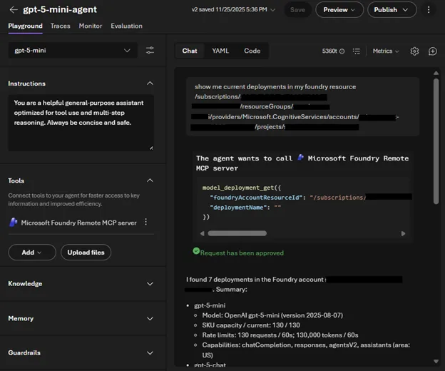 Snapshot of agent test chat using Foundry MCP Server in Microsoft Foundry