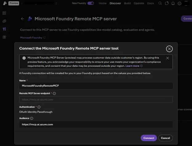 Or when you want to build an agent on Microsoft Foundry and empower it with Foundry MCP Server, you can visit Tools menu on Microsoft Foundry, find the server, and create a tool connection to the server with one-click.