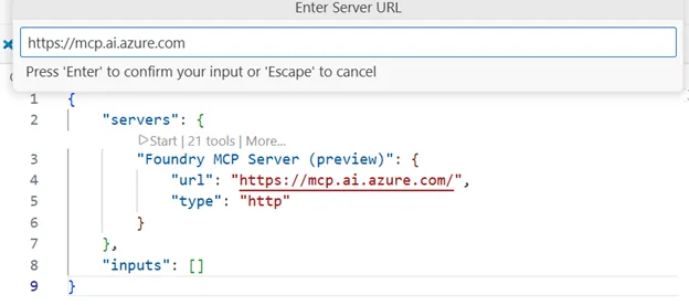 Now you can add Foundry MCP Server to use with VS Code. Follow Use MCP servers in VS Code or click quick link for VSCode to add it: You can use https://mcp.ai.azure.com as the url, and http as the type. VS Code will generate an entry that looks like this: