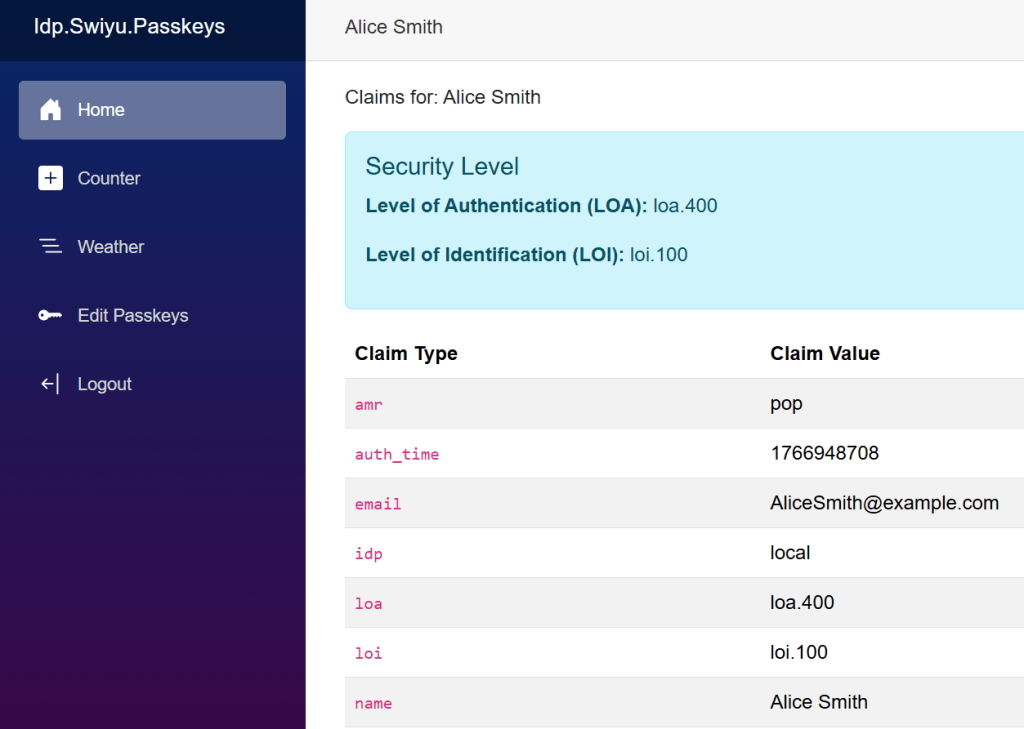 The index.html.cs file contains the additional claims implementation. The “loa” and the “loi” claims are added here, depending on the level of authentication and the level of identification. As the User.Claims are immutable, the claims need to be removed and recreated. The amr claim is also recreated because the ASP.NET Core Identity sets an incorrect value for passkeys.