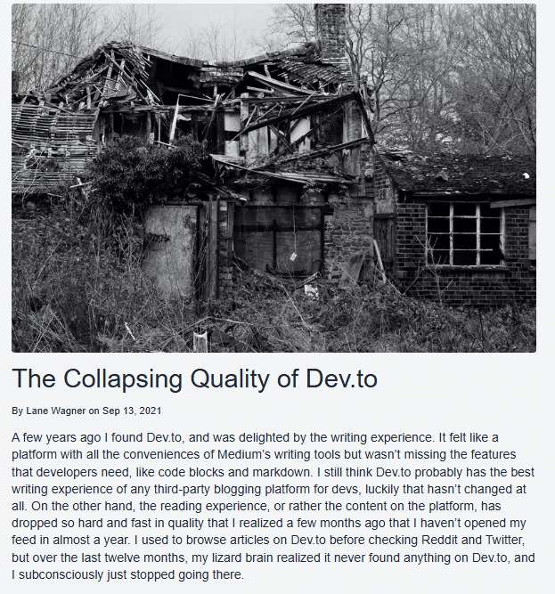 Five years ago, Lane Wagner argued in his post The Collapsing Quality of Dev.to that the platform’s overall content quality was declining, with repetitive, low-effort, and beginner-focused posts crowding out deeper, more insightful content – and that was long before the rise of the current AI-driven flood.