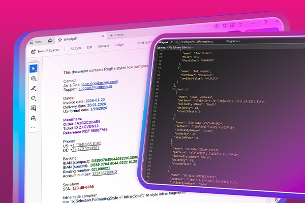In this article, we demonstrate how to apply inline styling to text in TX Text Control using regular expressions defined in JSON format. This approach allows for dynamic and flexible text formatting based on specific patterns.